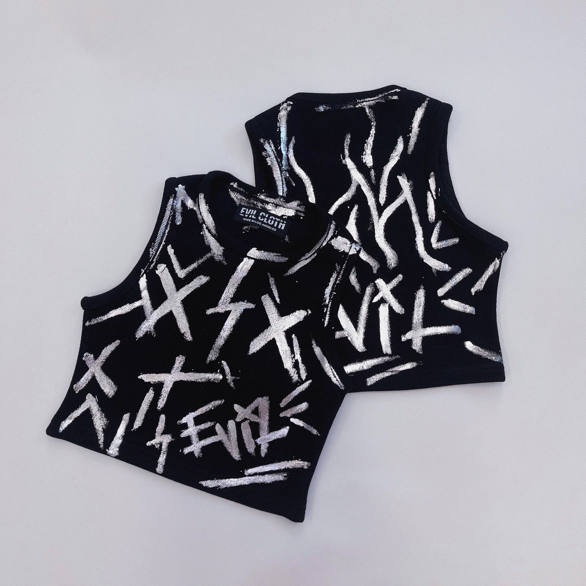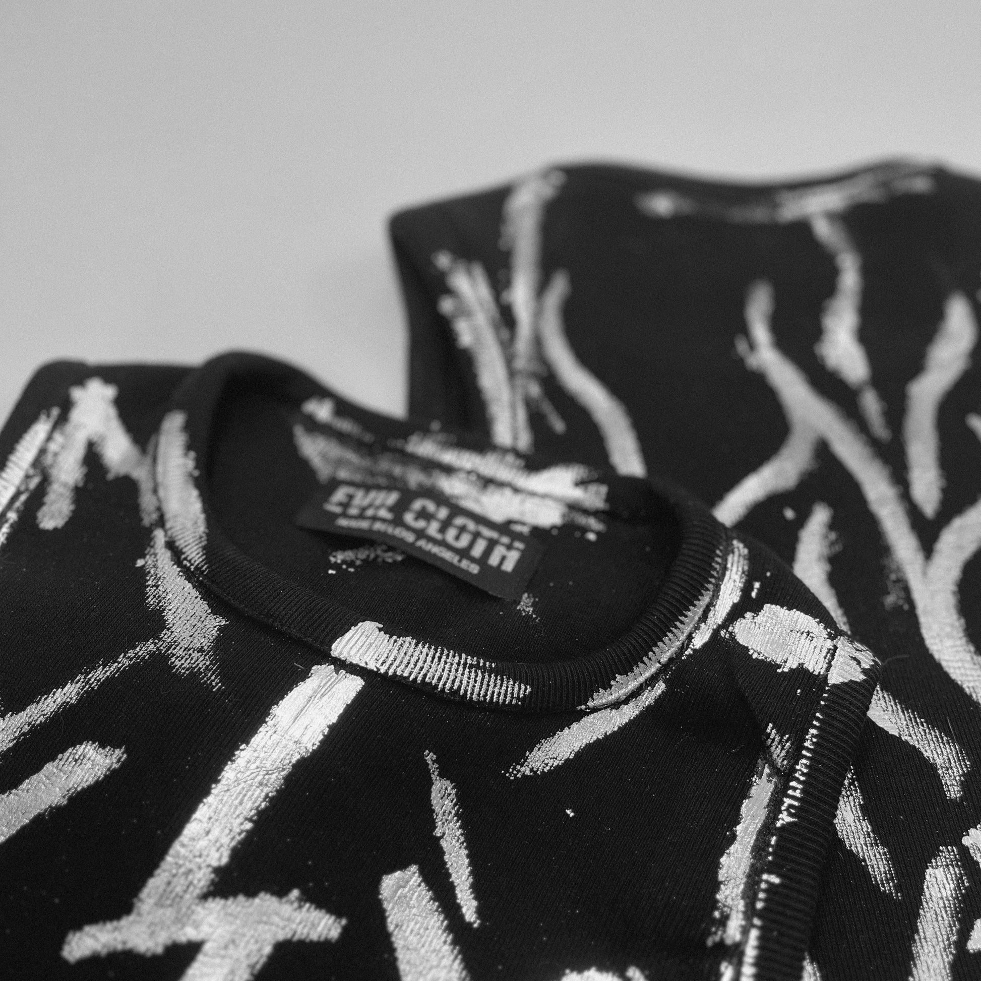 This is a truly unique and one-of-a-kind garment. Our METAL FOIL TANK TOP is made of 100% cotton ribbed fabric, this top features hand-drawn art printed with foil for a striking and individualized look.