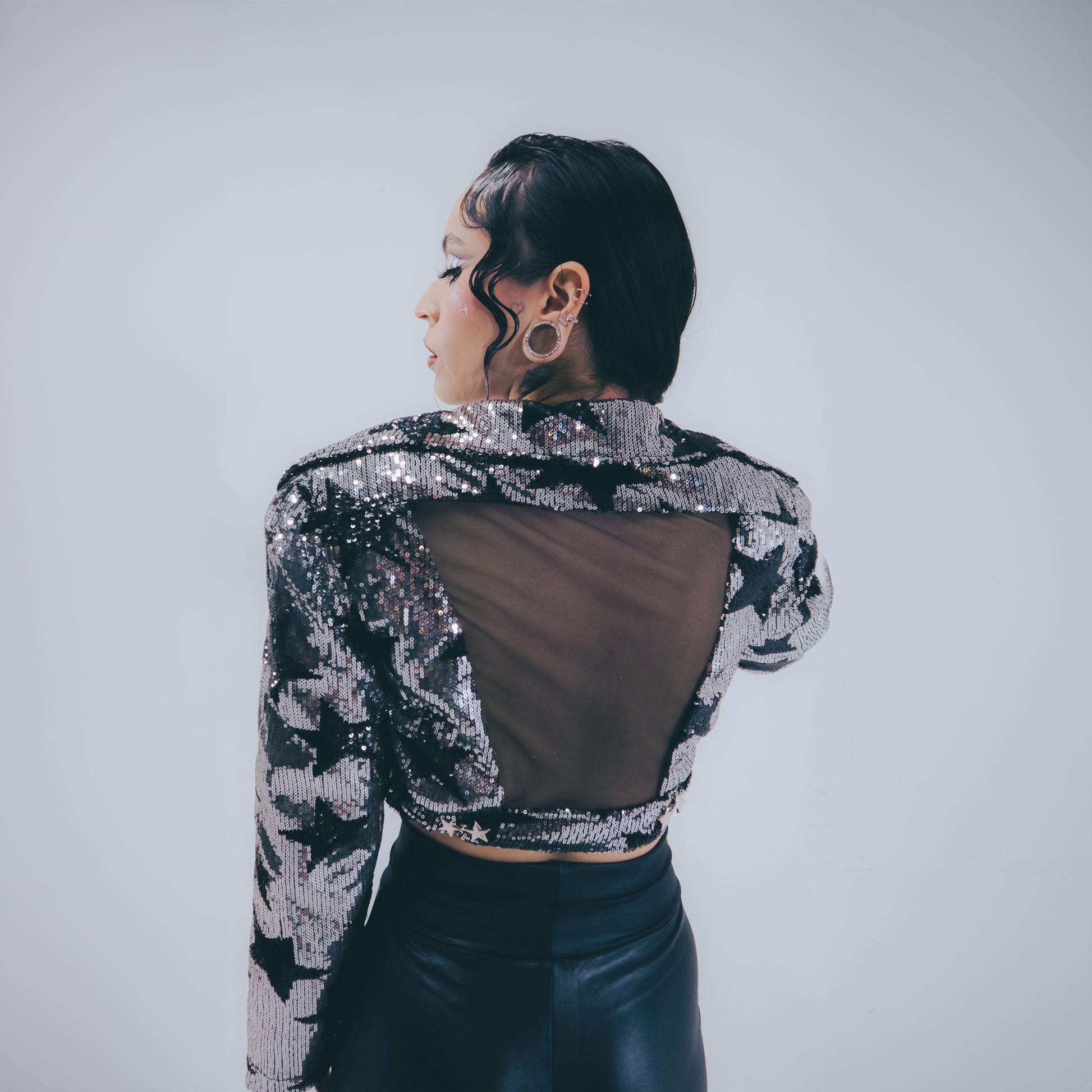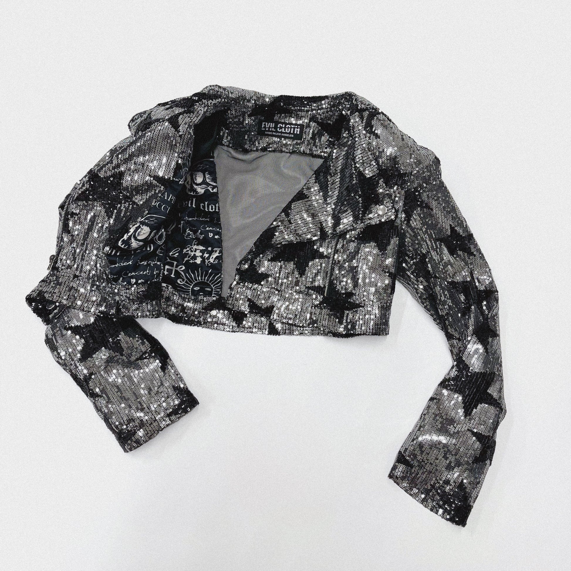 Introducing ''STARLIGHT'' POWER SHOULDER BIKER JACKET, featuring stunning sequin details and removable shoulder pads for customizable style. Elevate your look with this must-have piece.