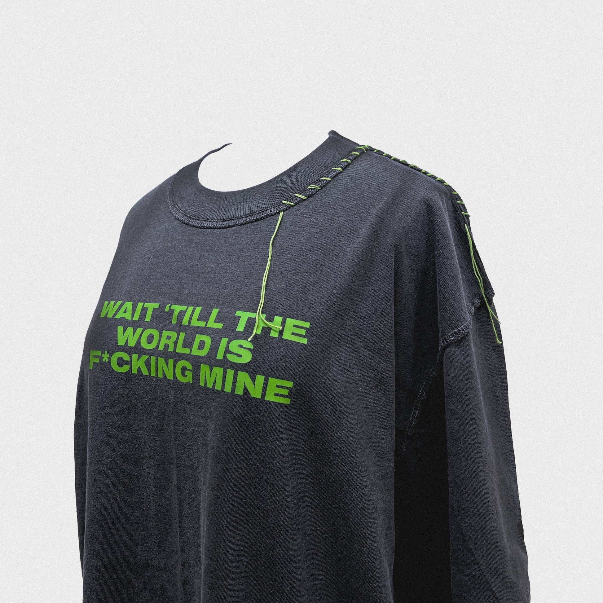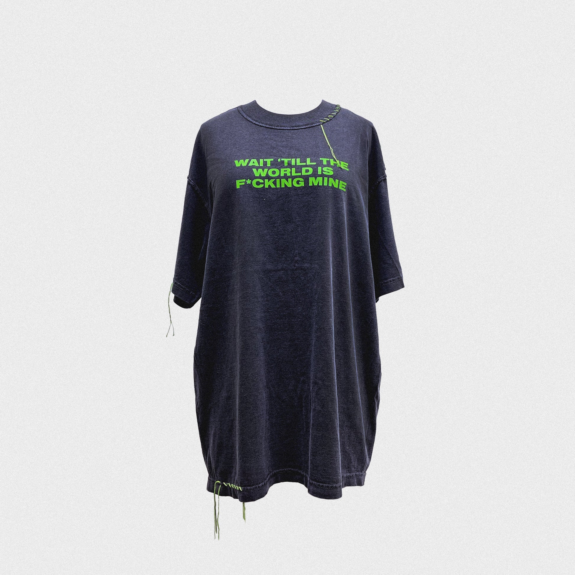 This 100% cotton t-shirt is a reverse shirt and features a hand-stitched design. With its statement phrase, "WAIT TIL'' THE WORLD IS F*CKING MINE," this oversized shirt is a bold statement. Are you going to take ownership of your world?