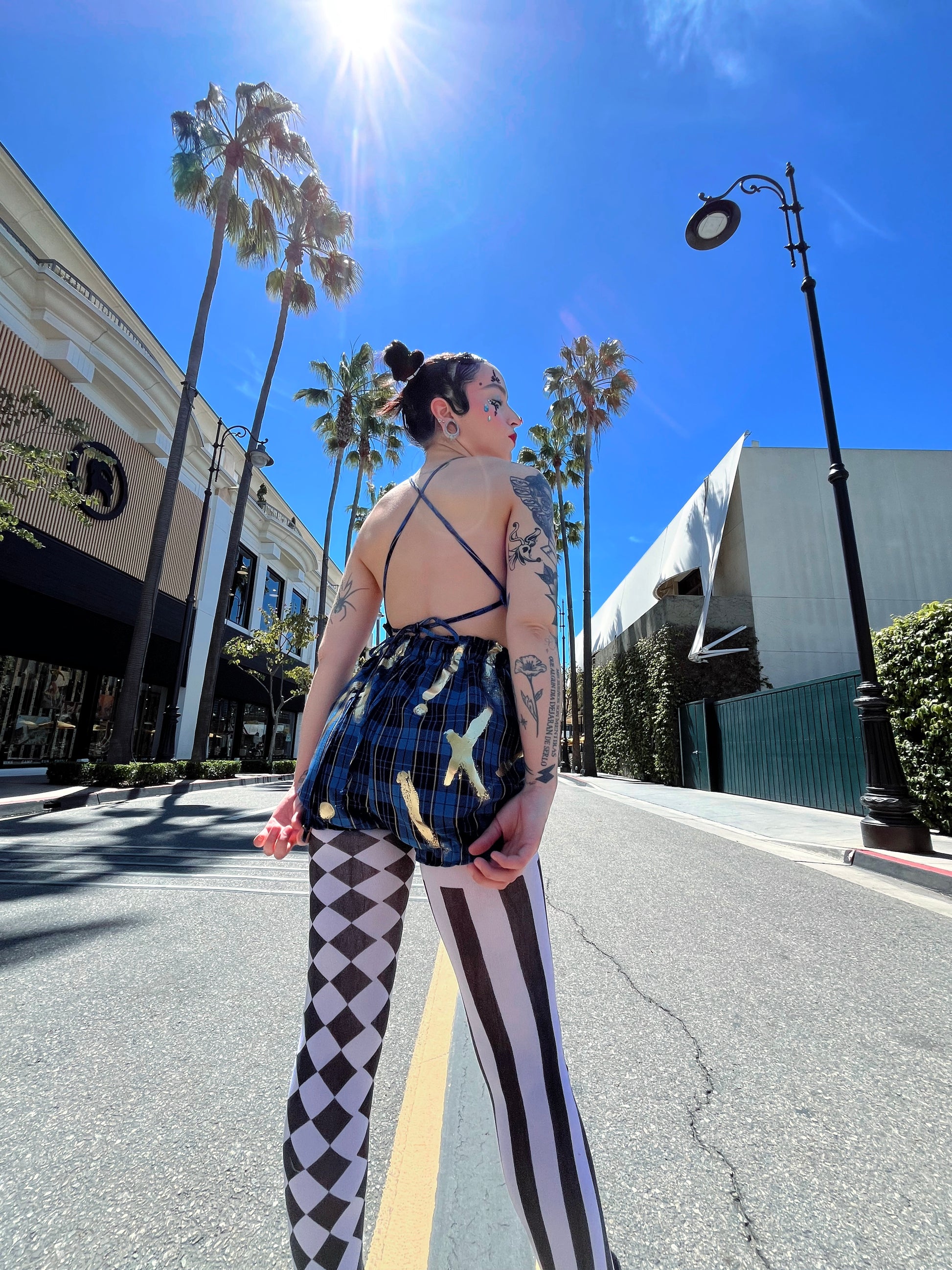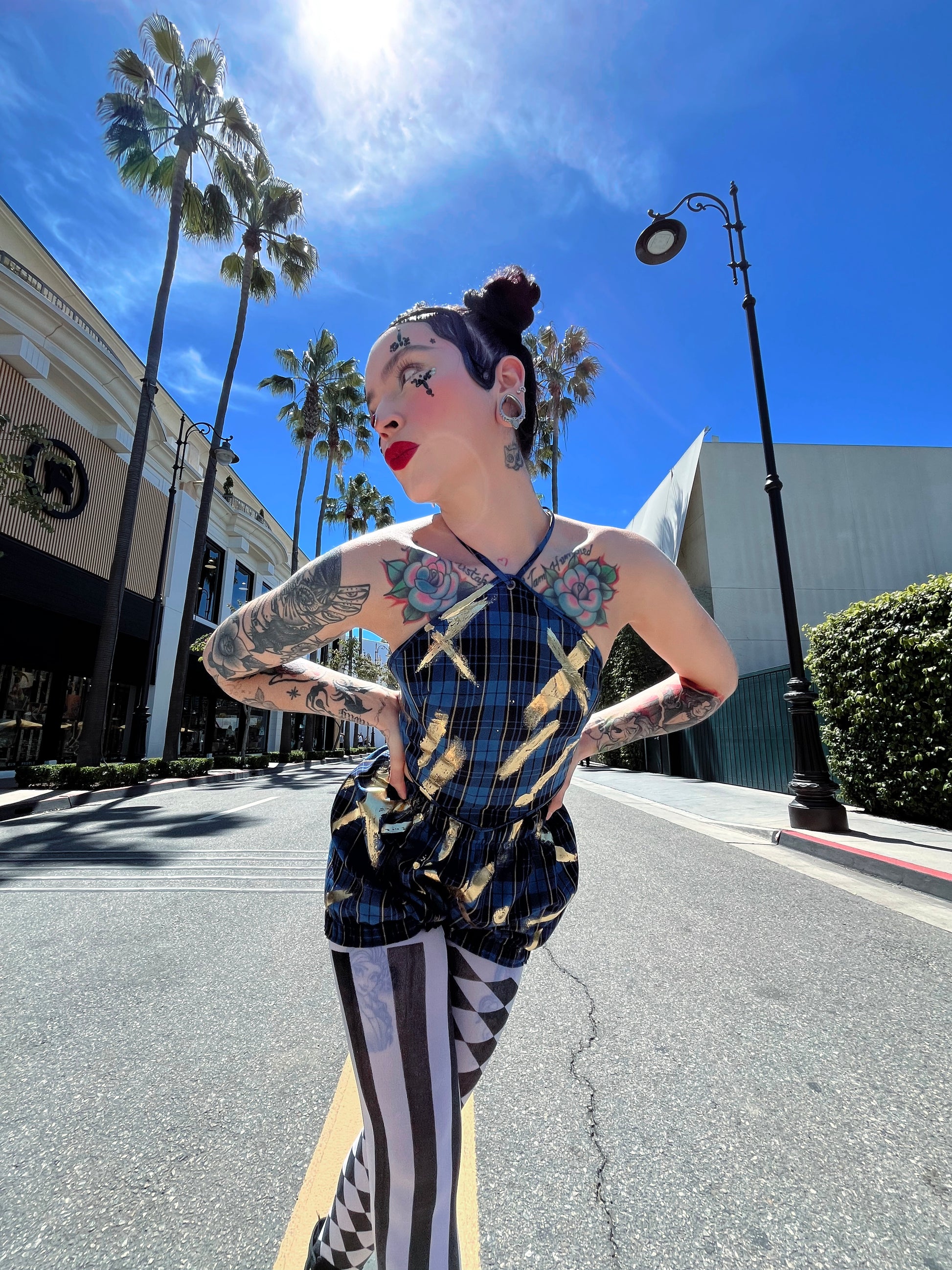 Presenting Foil FOOLS Blazer x CLOWN CORE! With blue tartan and gold foil accents, this blazer is a statement piece. The gold mesh adds a touch of contrast, and the shoulder pads and adjustable waistband provide a flattering fit. Stand out with style and confidence.
